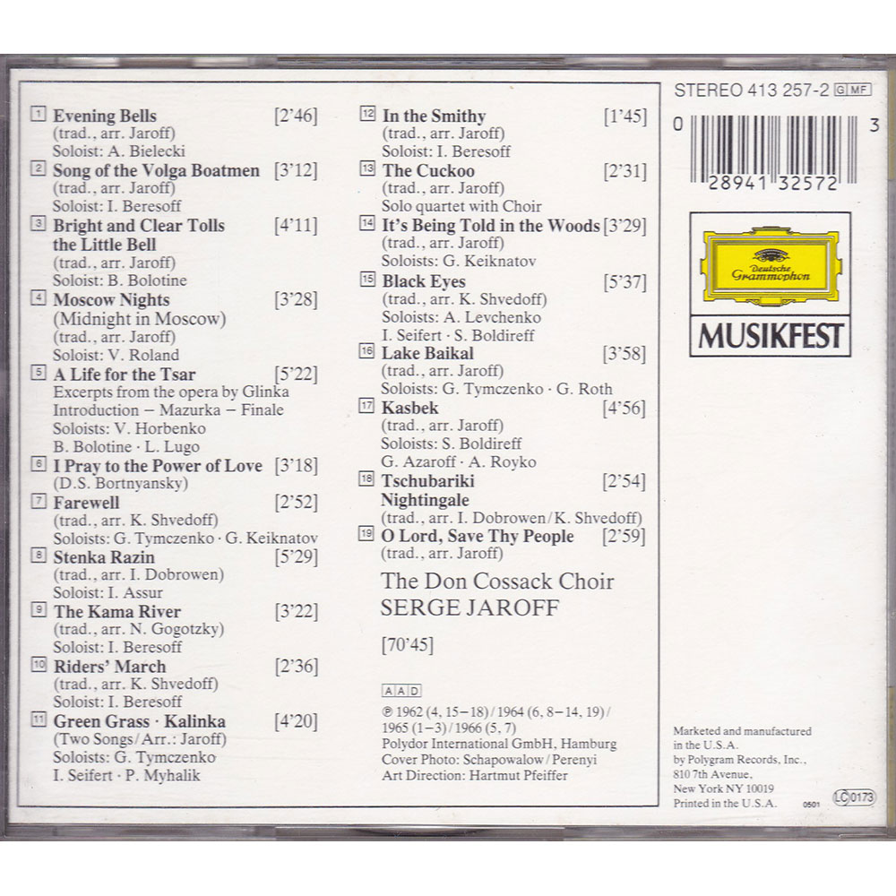 Artista: The Don Cossack Choir Serje Jaroff | Gravadora / Distribuidora: Deutsche Grammophon, Polygram | Label: 413 257-2 | Código de barras: 028941325723