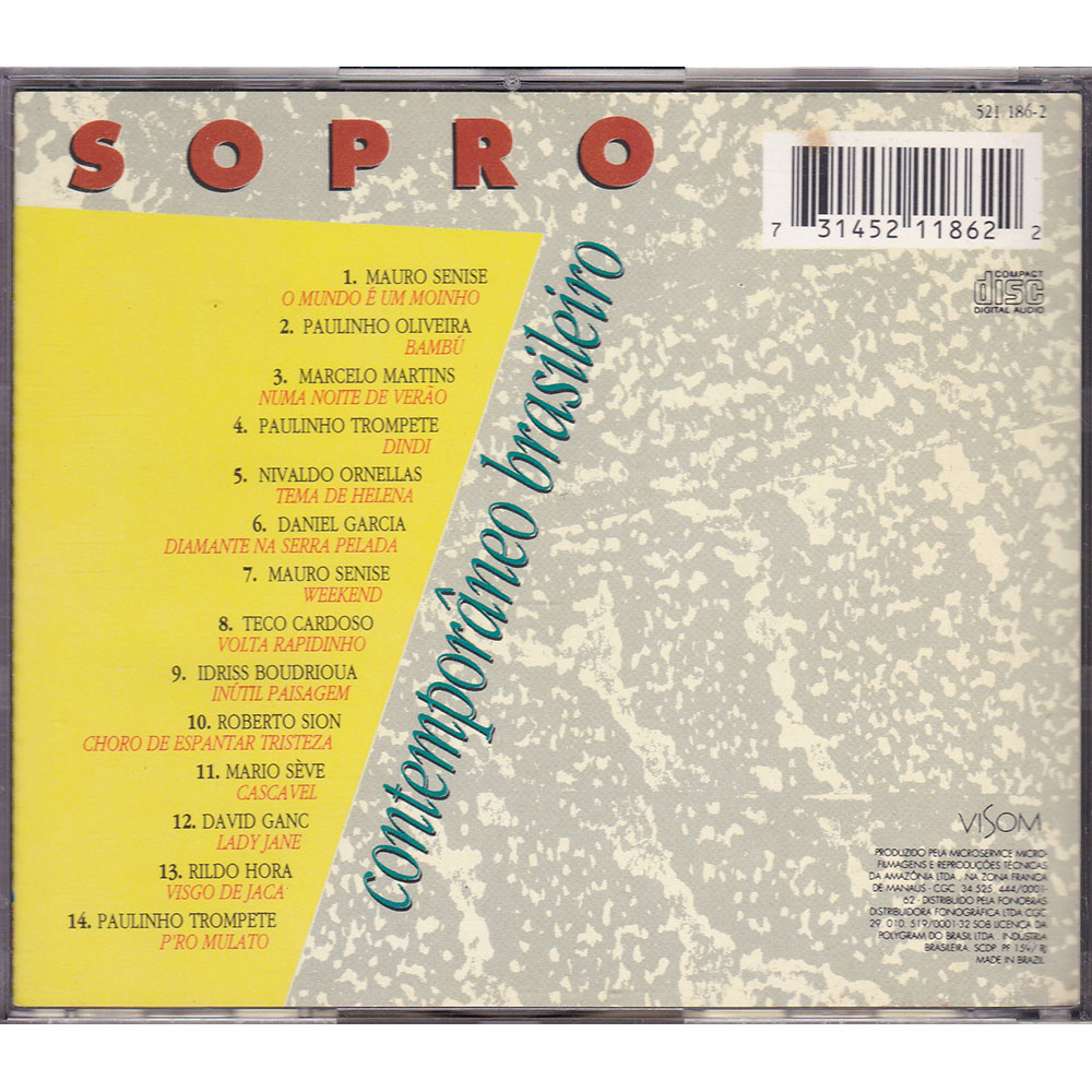 Artista: Mauro Senise, Paulinho Oliveira, Marcelo Martins, Paulinho Trompete, Nivaldo Ornellas, Daniel Garcia, Teco Cardoso, Idriss Boudrioua, Roberto Sion, Mario Sève, David Ganc, Rildo Hora | Gravadora / Distribuidora: Visom | Ano: 1993 | Label: 521 186-2 | Código de barras: 731452118622
