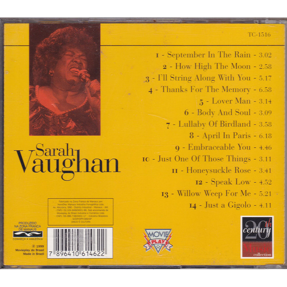Artista: Sarah Vaughan | Gravadora / Distribuidora: Movieplay | Ano: 1999 | Label: TC-1516 | Código de barras: 7896410614622